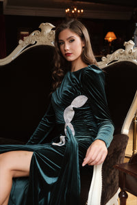 Το Gai Emerald Dress αναδεικνύει την κομψότητα και τη θηλυκότητα σε κάθε σιλουέτα. Συνδύασέ το με ασημί ή nude αξεσουάρ και ψηλοτάκουνα πέδιλα για μια εκλεπτυσμένη βραδινή εμφάνιση. Ένα χαλαρό σινιόν ή κυματιστά μαλλιά θα αναδείξουν το σκίσιμο στο πόδι και την εκλεπτυσμένη λάμψη της πλεξίδας με στρας, προσδίδοντας μια couture νότα στην εμφάνιση.
