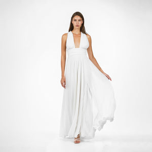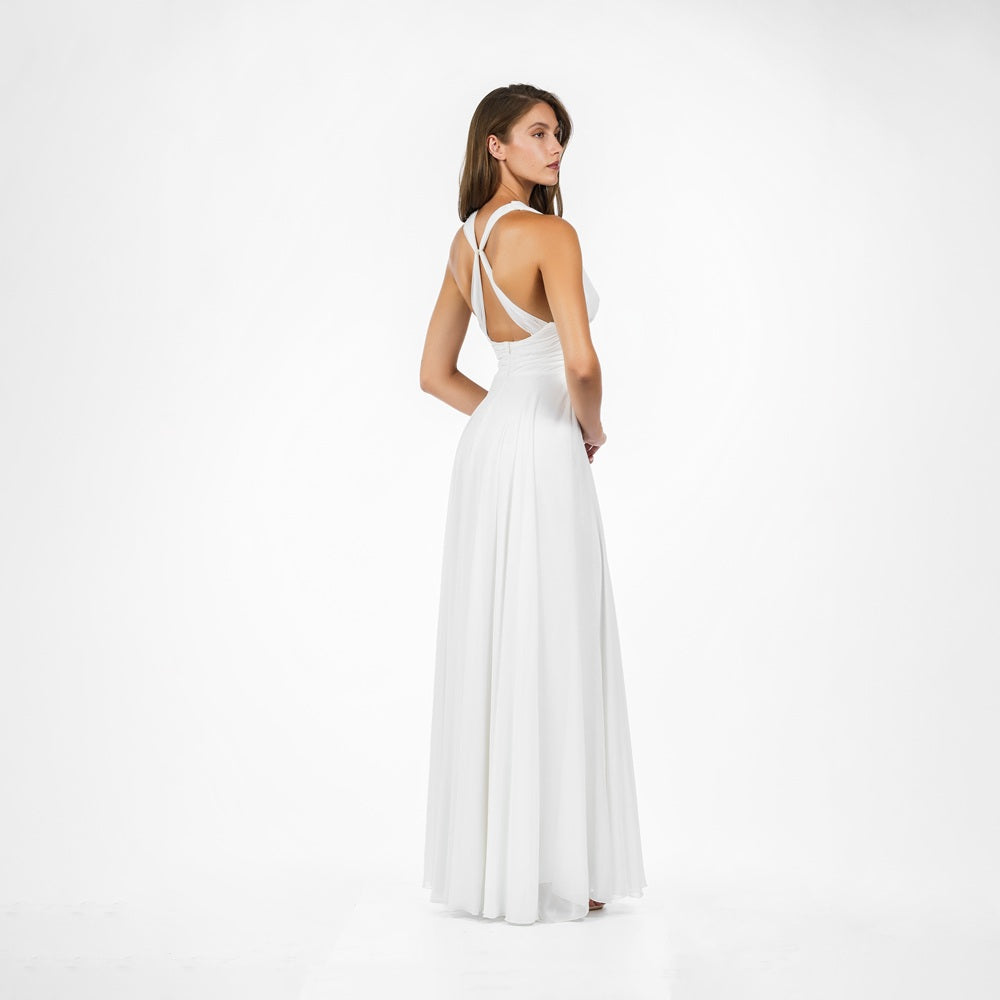 Αέρινο νυφικό φόρεμα με ριχτή γραμμή, θηλυκό ντεκολτέ και εντυπωσιακή χιαστί πλάτη. Ρομαντικό και κομψό, ιδανικό για καλοκαιρινούς γάμους με ανεπιτήδευτο στυλ.